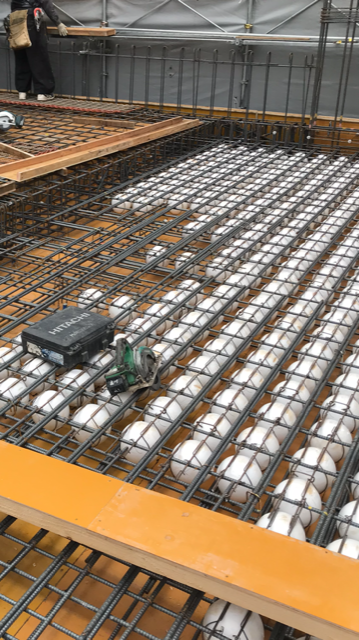 二月も、終盤にかかり日中の気温が、急激に上がりました!今日は、三月末から四月中旬ごろの気温まで上昇したみたいです!明日以降も、気温が、高いみたいです!仕事が、はかどる気温ですが、気を引き締めて作業する様に心がけています!今回は、ボイドスラブのコンクリート打設前の様子です!ボイドスラブとは、柱 梁を一般工法より距離を伸ばす為の工法で、スラブ(床)の面積増やす為に用います!そうすると強度的にスラブが弱くなってしまう為、厚みを厚くします!コンクリート重量が増すとまたスラブに負担がかかる為、それを解消する為の工法です!重量の軽減、コンクリートの削減に繋がります!スチロールの玉をコンクリートの中に埋め込みます!