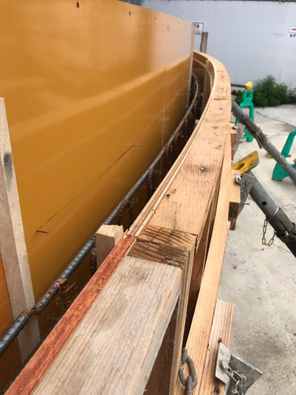 梅雨も明け、連日猛暑が続いていますが、もうすぐお盆休みです!今年は、8月14〜18になります。会社がある大和郡山の夏祭りも、3日の土曜に行われ、あっという間に盆休みですが、この時期が夏の中で最も暑い時期なので、熱中症に注意しながら作業していますが、作業場は40度近くになっていると思われるので、作業員には、空調服の着用、防暑タレ、作業場に工場扇の設置、防暑タレを水に濡らす、水筒の持参、塩飴、などを指導しています!それでも体調不良者が、出てしまうほど猛暑なので、毎日作業前に、健康状態の問いかけも行う様にしています!毎年の事ですが、今年も頑張って夏を乗り切りたいと思います!今回の現場写真ですが、Rの型枠〔円形)の完成の様子です!