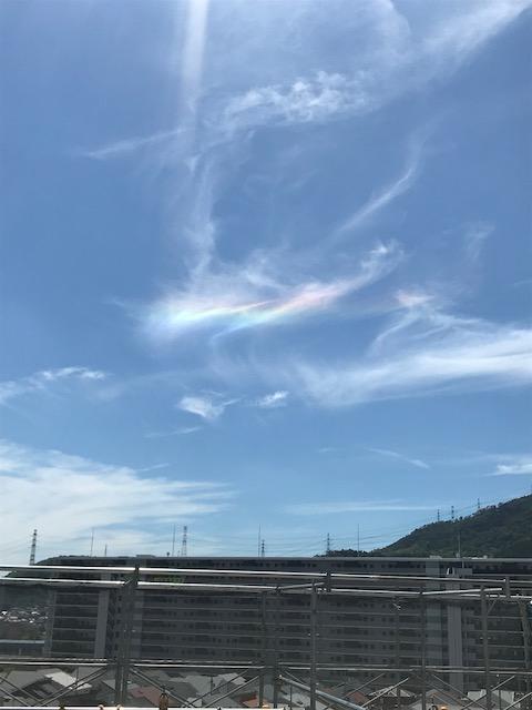 盆休みも、終わり酷暑のピークも過ぎて比較的、作業しやすくなりましたが、まだまだ熱中症にも気をつけて作業しています!最近はゲリラ豪雨、あおり運転なども有り通勤にも気をつけてます!残暑厳しいですがもうすぐ秋なので頑張っていきます!さて、今回の写真ですが高槻方面の現場で、彩雲と思われる雲を発見したので紹介します!作業途中にふと空を見上げて見ると有りました!